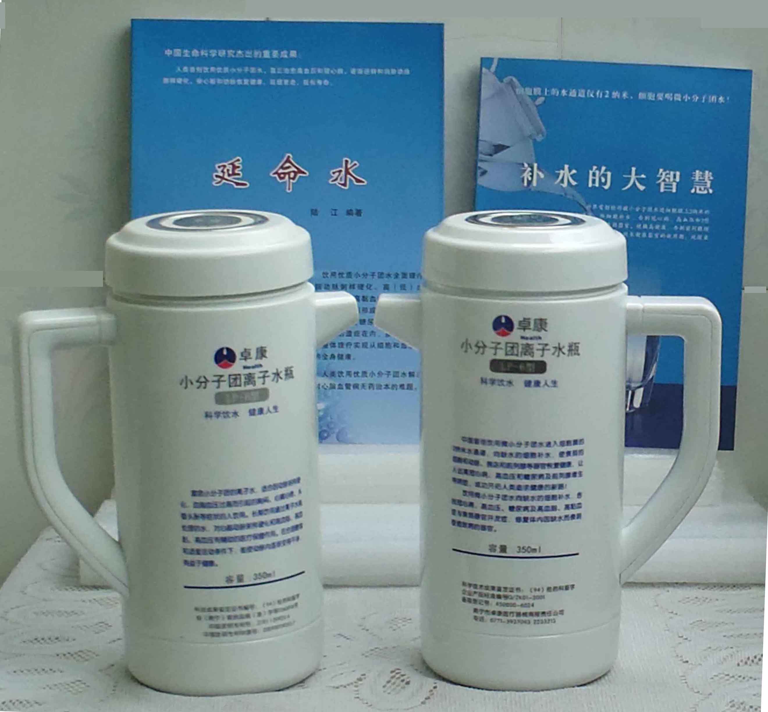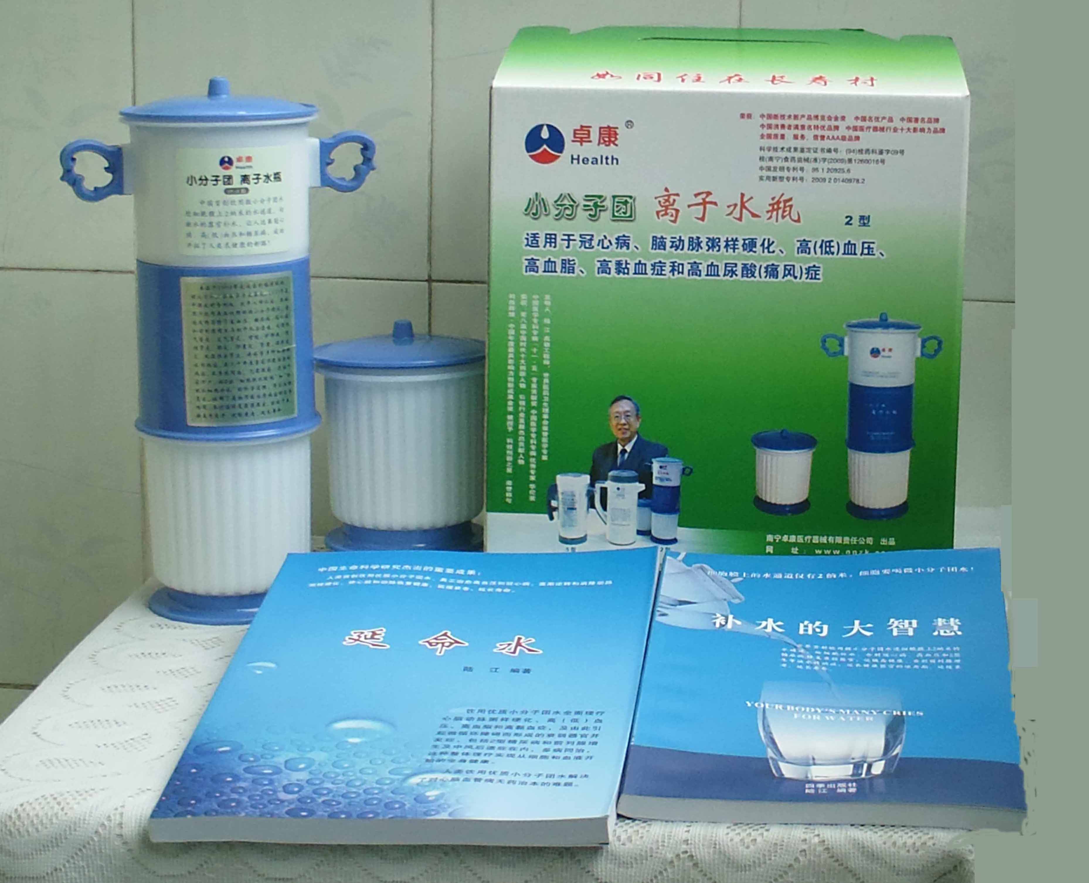 本品大量用戶的使用效果表明,能治愈冠心病、腦動脈硬化、原發性高(低)血壓、高血脂、高粘血癥、高血尿酸癥(痛風)和2型糖尿病、衰弱器官并發癥(前列腺增生、腎衰與尿毒癥)及中風后遺癥等療效好。產品配信譽卡。使用壽命30年,不換芯,易清洗。團購優惠。從郵局匯款,匯費1%,地址按本頁下方地址、聯系人寫。從銀行匯款,請點擊[聯系匯款]欄,從工商銀行匯款,建設銀行、農業銀行匯款,均免收匯費,匯款后20--30分鐘內發短信,可用微信轉帳,均免匯費,微信號即手機號13768308380。匯款后,告知你的姓名和地址,我公司聯系人手機號是:13768308380。卓康牌離子水瓶為我公司獨家生產,郵購產品配《補水的大智慧》彩印書一本,另配四季出版社出版的新書《補水的大智慧》一本,并配光盤一張(含央視主持人釆訪陸江的對話視頻)。目前市場和"淘寶網"上有人兜售假冒的偽品,望讀者審察辯別真偽,造假者剽竊假冒本公司的各種證、獲獎獎項、專利號和外包裝盒上的中英文字,包括科技成果的鑒定意見等,請讀者注意防偽。如何識別假貨?已經買了假貨怎么辦?(請點擊[打假掠影][打假掠影])。