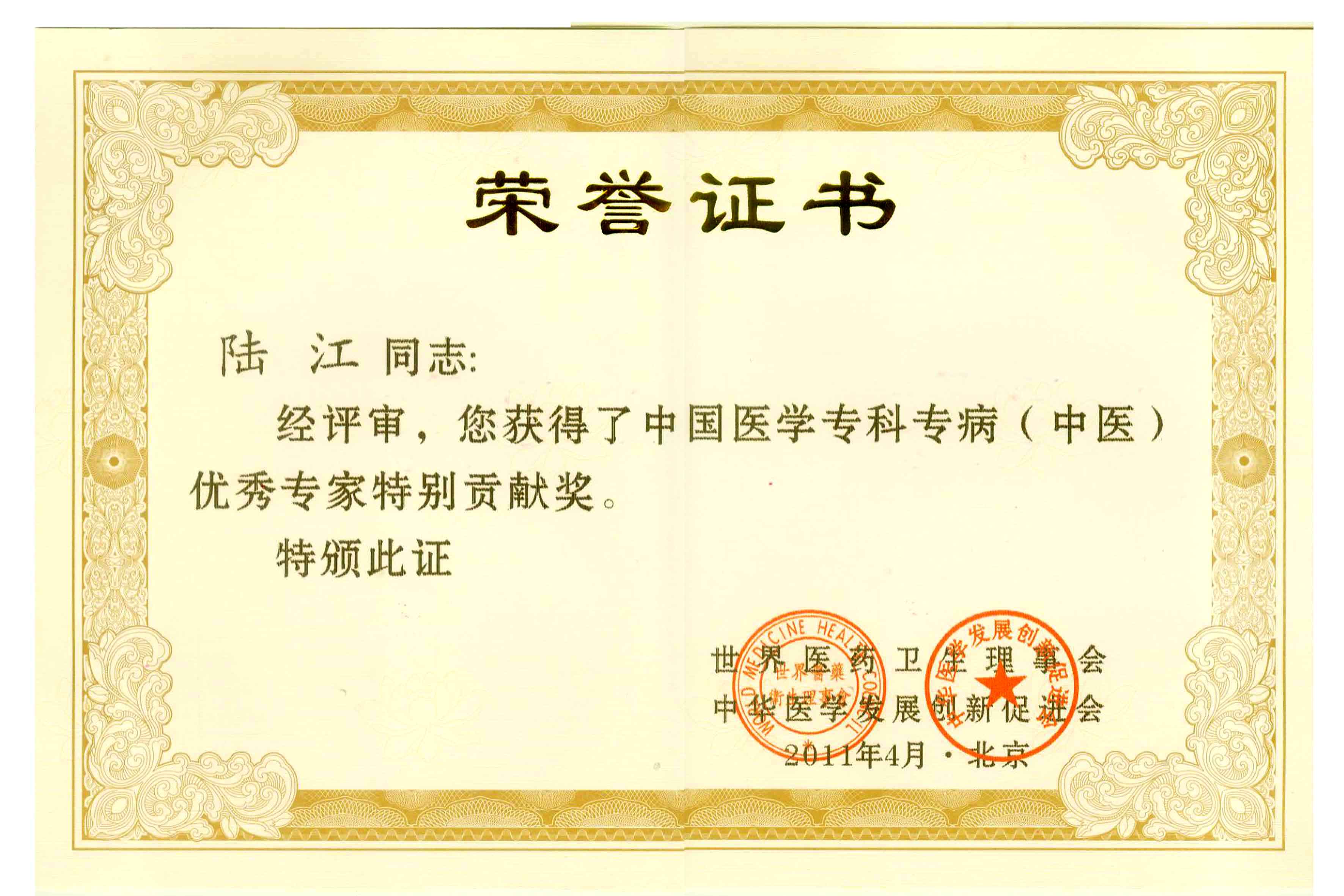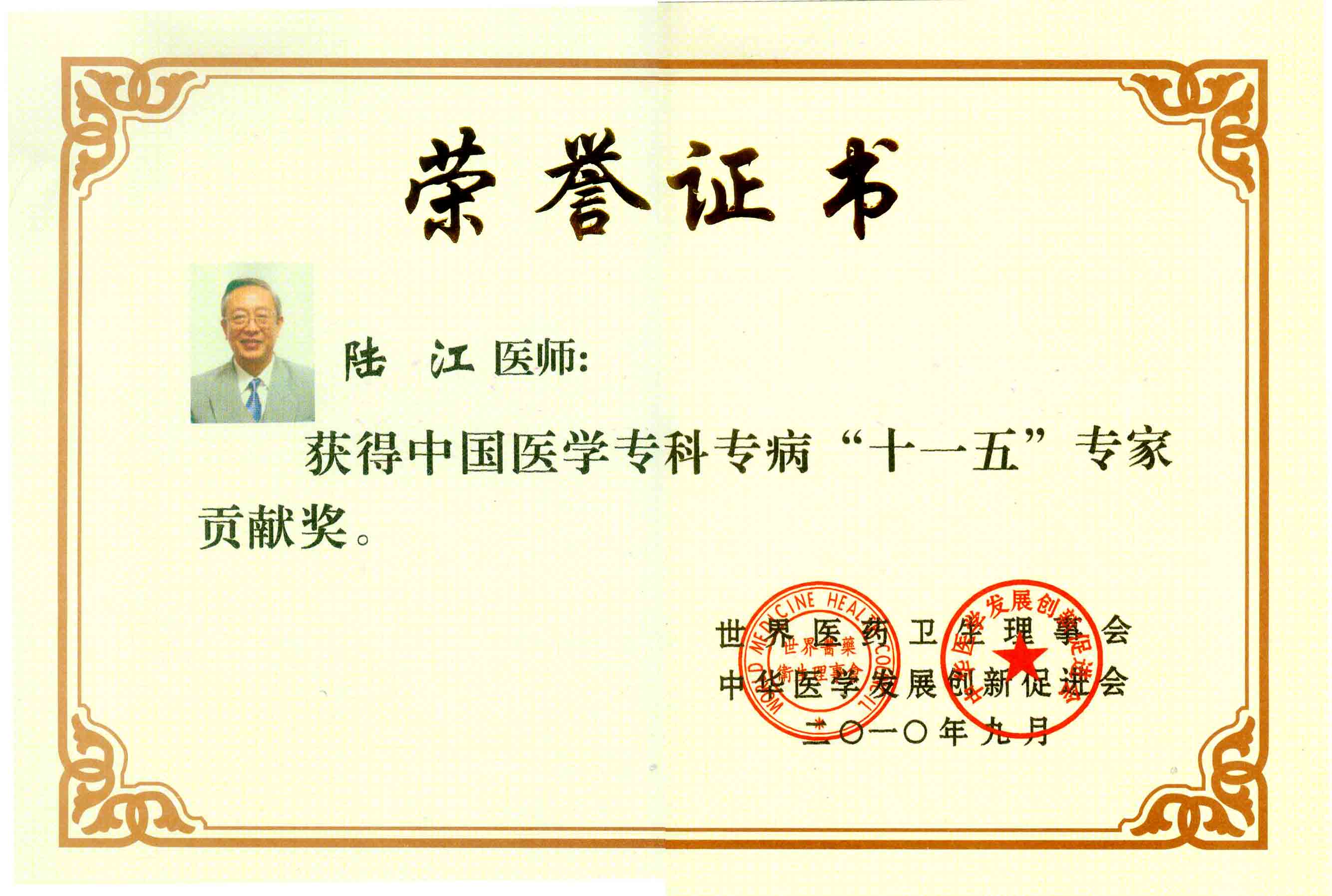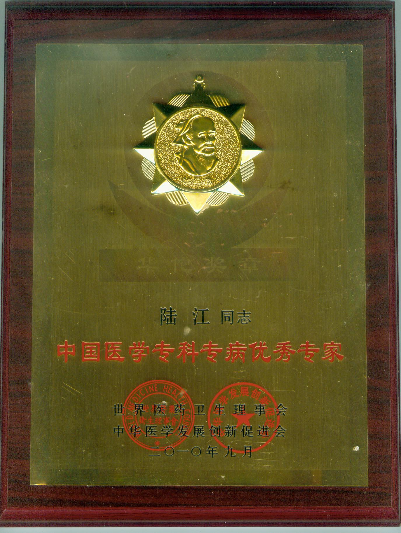 陸江獲得中國醫學??茖2炐銓<沂褎e貢獻獎