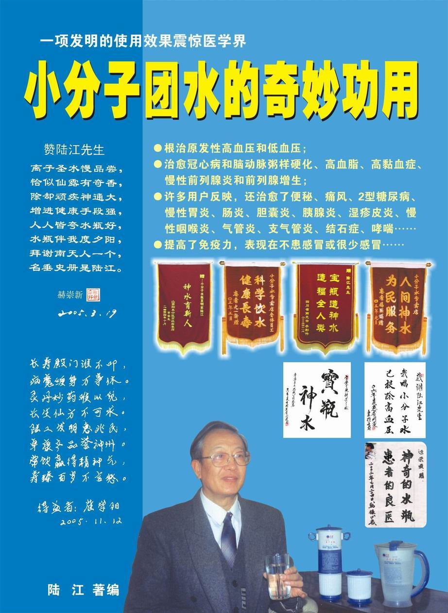人類幾千年來患以上病癥需終生服藥,幾十年也不能治愈。可是我國南寧的高級工程師陸 江,于1990年想根治高血壓,研究發明了離子水瓶,處理出微小分子團水供飲用,經過醫院臨床試用和專家鑒定,1999年獲中國發明專利權,產品于2000年投放市場后一直跟蹤調查,據全國各地用戶反饋:祛除了高低血壓、糖尿病和冠心病,并使前列腺增生、咽喉炎、鼻竇炎、慢性氣管炎、支氣管炎、矽肺病、哮喘、慢性胃炎、腸炎、慢性膽囊炎、慢性腎炎、腎衰、膀胱炎、便秘、痔瘡、風濕性關節炎和濕疹皮炎及中風后遺癥等病癥不藥而愈。為什么喝微小水能治20多種???陸 江從1991年德國科學家發現細胞膜水通道僅為2納米獲得啟發,認為多種器官患病是因細胞脫水,不能正常代謝和分裂增殖,才使器官細胞減少致衰弱萎縮而形成細胞缺水性病癥。22年來的實踐有力地支持了“細胞脫水致病”這一重要論點,表明喝微小水可滿足細胞的生理需求,補水就能祛病,是生命科學新亮點。
